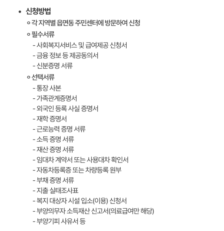 필수 서류에는 사회복지서비스 신청서, 금융정보 제공 동의서, 신분증명서 등이 포함됩니다.