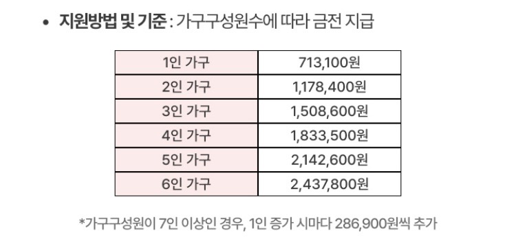 특히, 가구 구성원 수에 따라 지급 금액이 달라져 맞춤형 지원이 가능합니다. 예를 들어, 1인 가구는 713,100원이 지급됩니다.