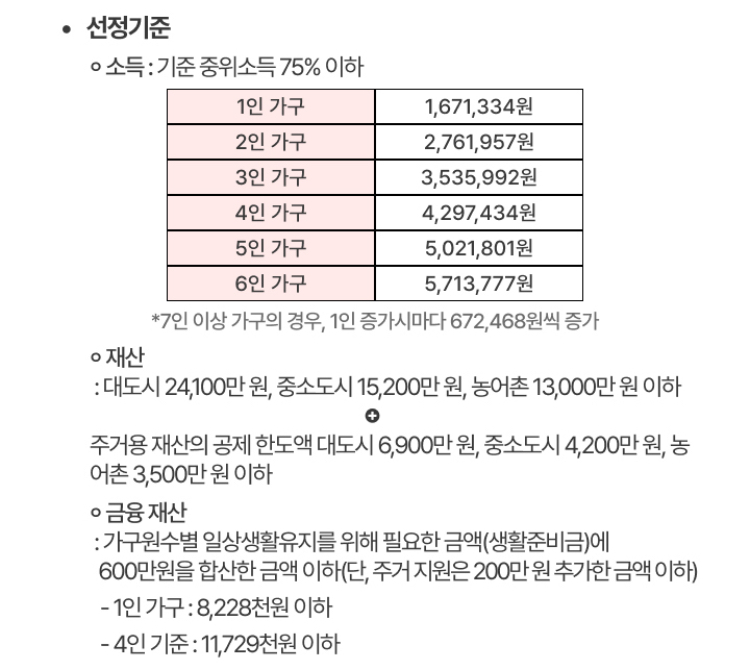 선정 기준은 중위소득 75% 이하인 가구로 설정됩니다. 예를 들어, 4인 가구의 경우 4,297,434원 이하이어야 합니다.