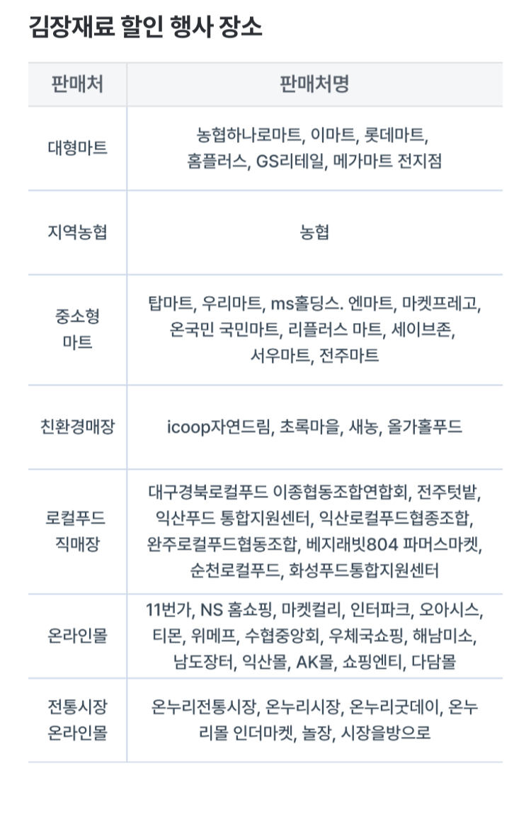 김장재료 할인 혜택을 받을 수 있는 장소는 매우 다양합니다! 대형마트부터 지역농협, 친환경 매장, 로컬푸드 직매장까지 폭넓은 선택지가 마련되어 있어요. 주요 대형마트로는 농협하나로마트, 이마트, 롯데마트, 홈플러스 등이 있으며, 중소형 마트와 친환경 매장에서도 다양한 할인 혜택을 만나볼 수 있습니다.