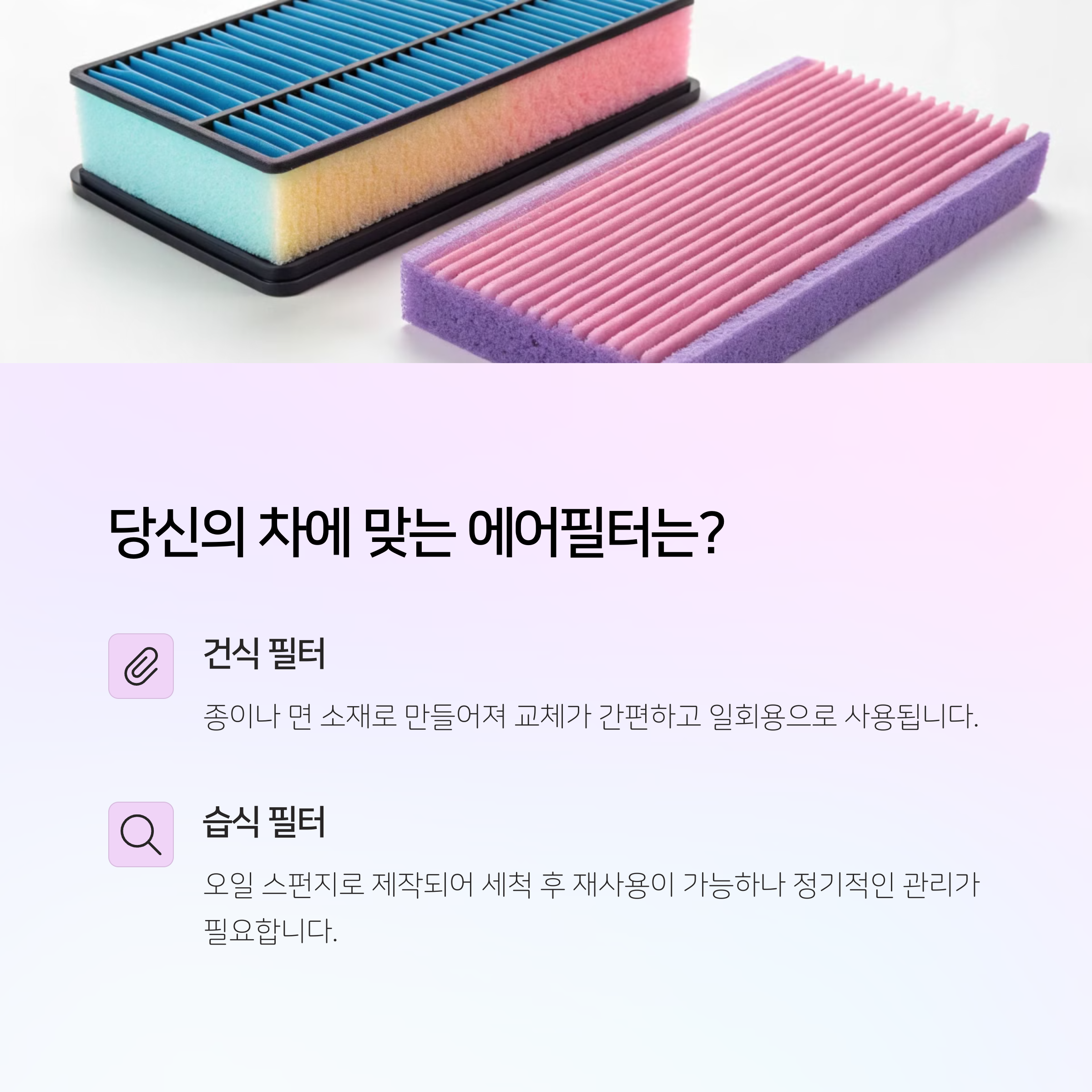 | 종류 | 건식(종이, 면재 등)과 습식(오일 도포) 필터로 구분 |