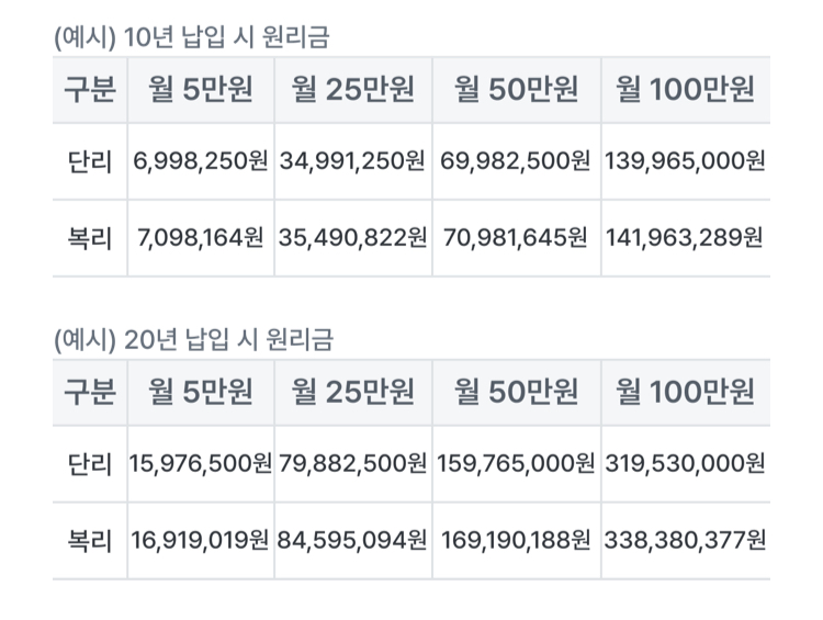 예를 들어, 월 100만 원씩 20년 동안 납입할 경우 단리 이자에 비해 약 1,800만 원의 추가 수익을 볼 수 있습니다. 이는 자영업자들에게 장기적인 재정 안정을 보장하는 의미 있는 자산 형성 방식으로 평가받고 있습니다.