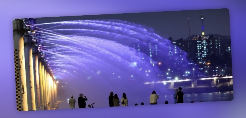 반포대교에 위치한 달빛무지개분수는 세계에서 가장 긴 교량 분수로, 길이 1,140m에 달하는 물줄기가 다리를 따라 흘러내립니다. 이 분수는 380개의 노즐을 통해 다양한 형태의 물줄기를 연출하며, 200여 개의 조명이 물줄기에 색색의 빛을 더해 아름다운 무지개를 만들어냅니다. 특히, 야간에는 음악과 조명이 어우러져 환상적인 분수쇼가 펼쳐져 방문객들에게 특별한 경험을 제공합니다.
