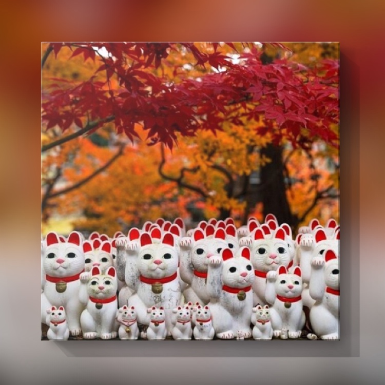 그러나 주요 매력은 본탑 앞의 작은 사원으로, 다양한 크기와 재료의 마네키 네코 피규어가 선반에 전시되어 있어 행운의 고양이의 바다를 형성합니다.