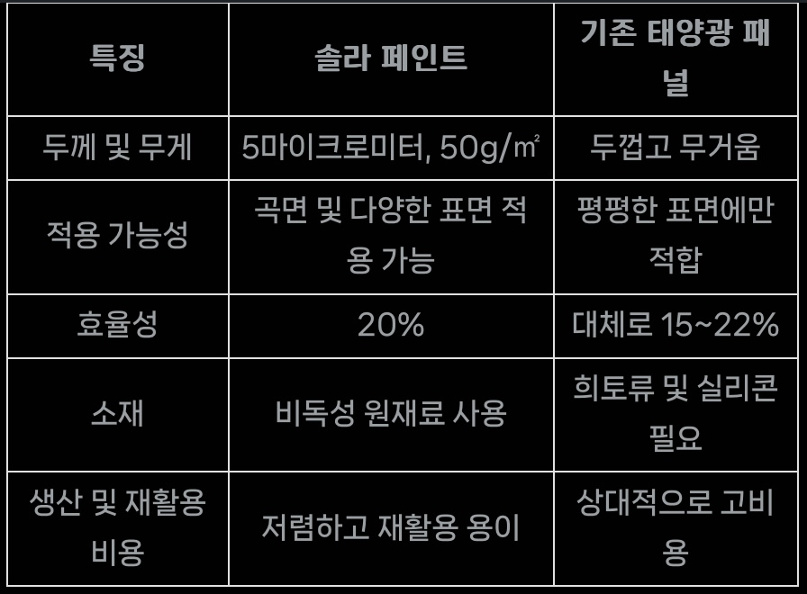 솔라 페인트와 기존 태양광 패널의 비교