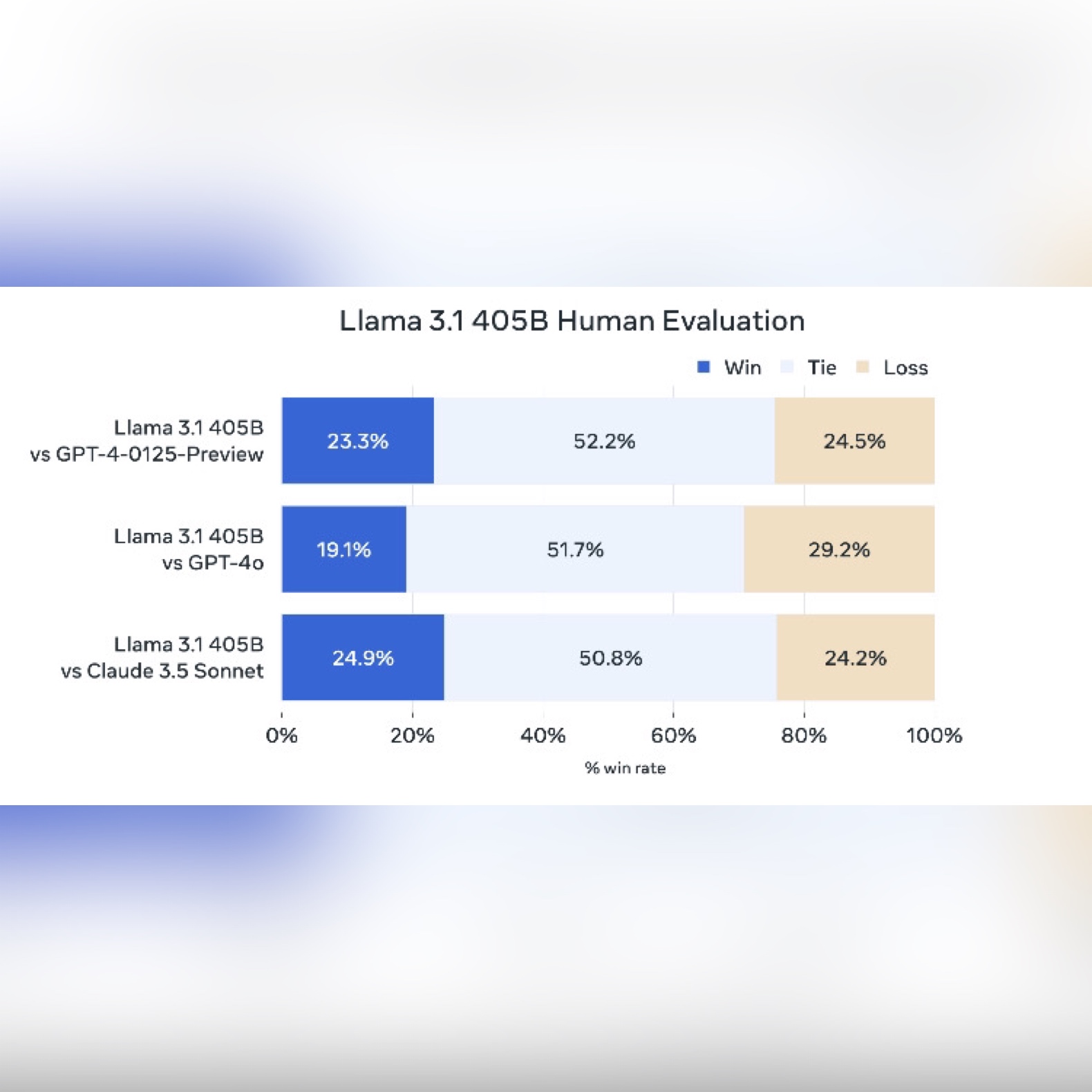 Llama 3.1 405B는 메타가 지금까지 개발한 AI 언어 모델 중 가장 진보된 모델입니다. 4,050억 개의 매개변수를 자랑하는 이 모델은 OpenAI와 Anthropic 등 주요 기업들의 독점 모델들과 견줄 만한 성능을 보여주고 있습니다. 특히 다양한 벤치마크 테스트에서 우수한 결과를 나타내며, 일부 영역에서는 기존 모델들을 능가하는 성능을 보여주고 있습니다.