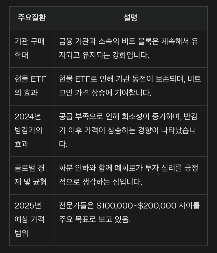 비트코인은 2025년에 걸쳐 강력한 상승 가능성을 보이고 있습니다. 기관 투자의 증가와 현물 ETF의 성공적인 도입, 그리고 공급 감소로 인한 희소성 증가는 모두 긍정적인 요인으로 작용할 것입니다. 그러나 시장 변동성과 규제 리스크는 여전히 주의해야 할 요소입니다.