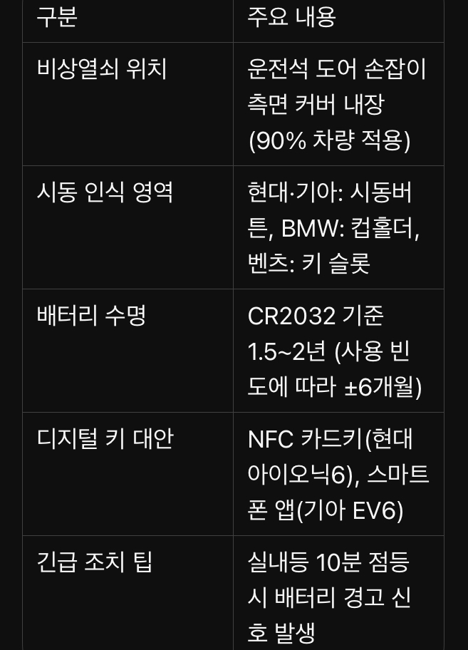 스마트키 방전은 단순한 불편을 넘어 안전사고로 이어질 수 있는 중대한 위험요인입니다. 본문에서 제시한 5단계 대응 매뉴얼을 스마트폰에 캡처해 저장해두면 긴급 상황에서 확연히 다른 결과를 만들 수 있습니다. 디지털 키 등장으로 물리적 키의 역할이 변화하고 있지만, 아날로그 방식의 비상대처법을 아는 것이 현명한 운전자의 필수 덕목임을 다시 한번 강조합니다.