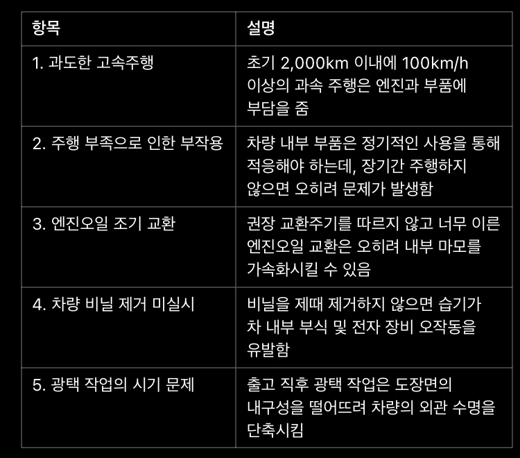 이러한 잘못된 관리 방법을 피하고, 제조사의 권장 사항에 따라 부드럽고 정속 주행하며, 정기적인 점검과 적절한 시기에 각종 부품을 교체하는 것이 신차의 성능과 내구성을 유지하는 데 결정적인 역할을 합니다.
