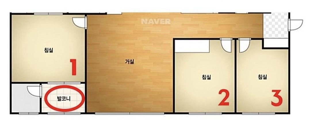 두 개의 방과 거실이 일렬로 배치되어 있어 폭이 2BAY 구조보다 좁게 설계됩니다. 주방이 옆으로 확장된 형태로 가구 배치가 다소 어려울 수 있습니다. 하나의 방은 다른 방들에 비해 채광이 부족하며, 현관이 복도식 구조로 되어 있어 어두울 가능성이 있습니다.