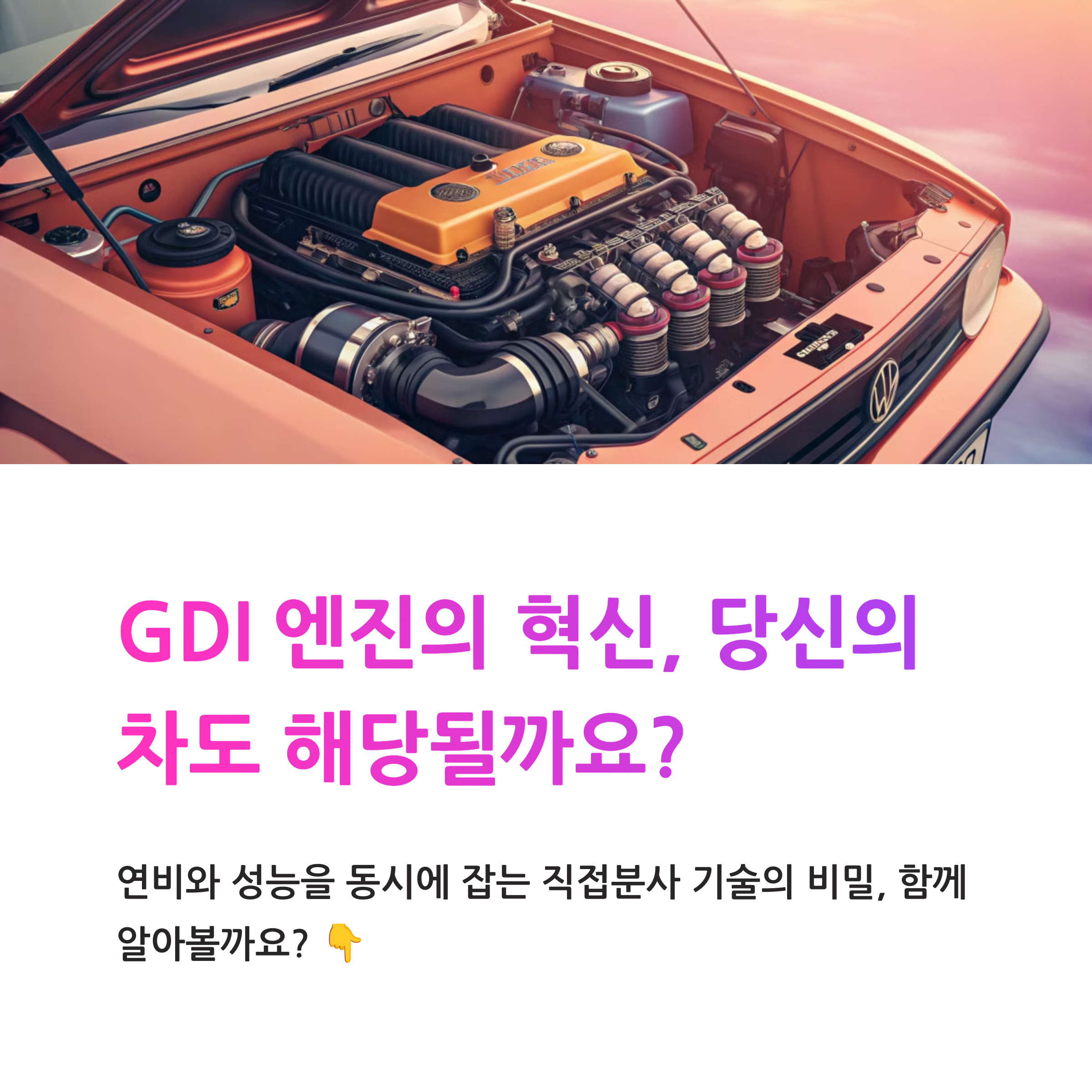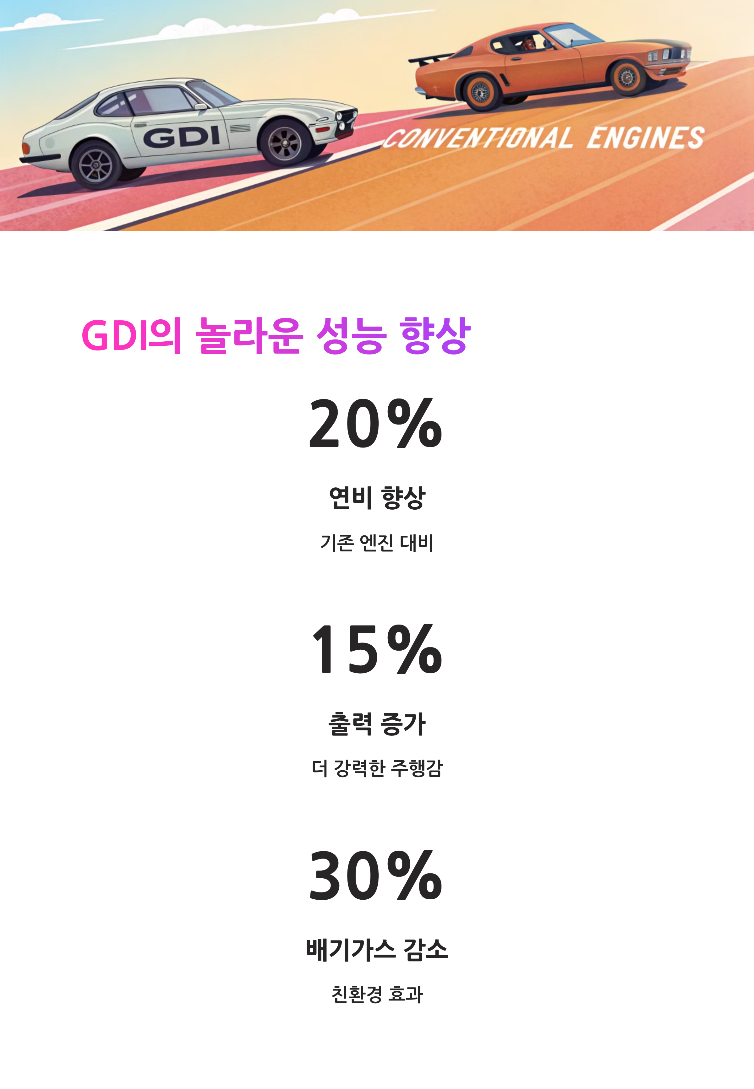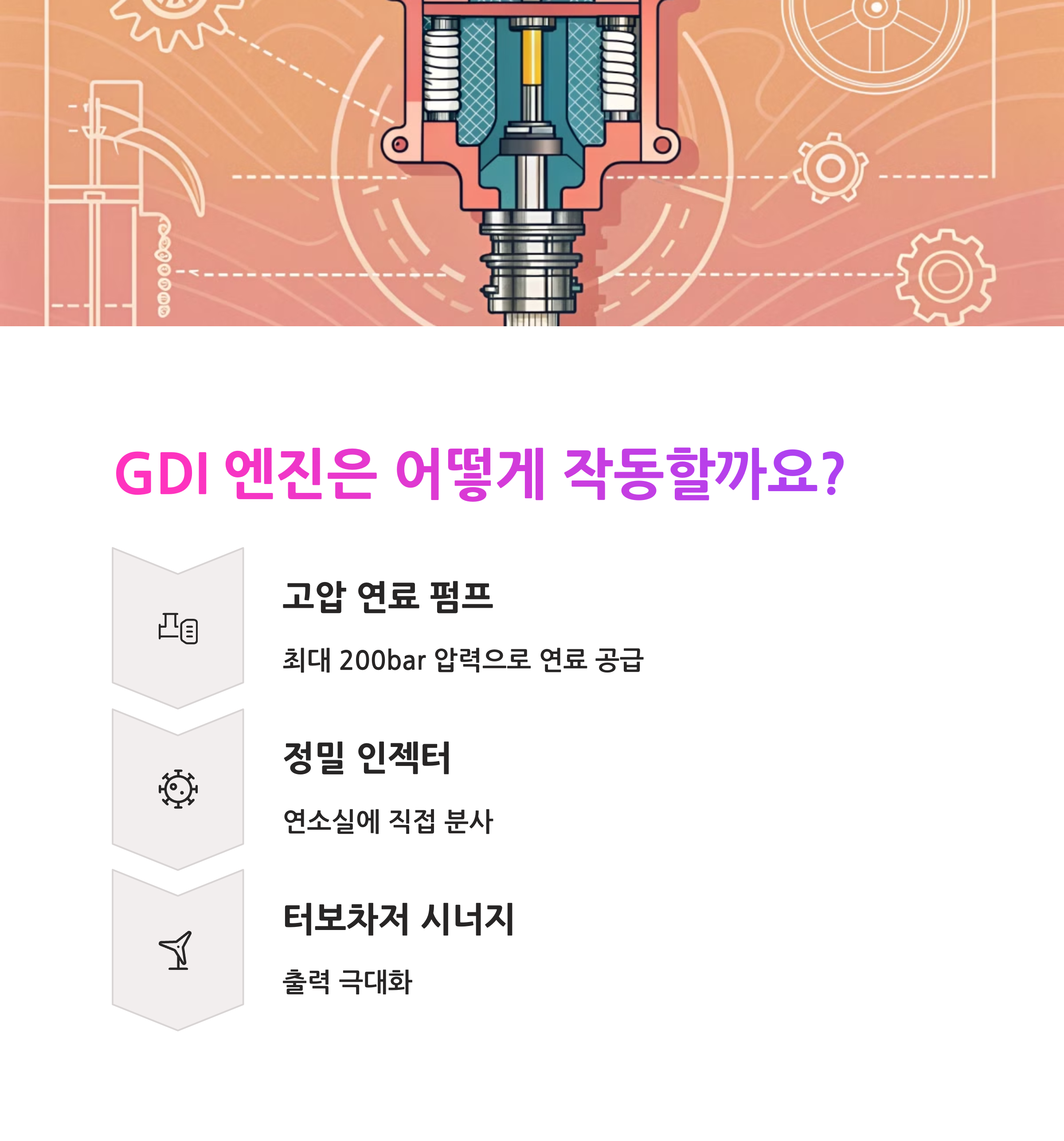 GDI 엔진은 가솔린을 연소실에 직접 분사하는 방식으로, 연료와 공기의 혼합 효율을 높여 연비와 출력 개선에 기여하는 엔진 기술입니다.