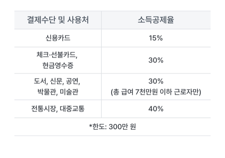 결제처별로 공제율이 다르기 때문에, 가급적 체크카드나 현금영수증을 활용하면 더 많은 세금공제 혜택을 받을 수 있습니다. 다만 한도는 총 300만 원까지이니, 과도하게 낸 영수증이라 해서 무제한으로 공제가 되는 것은 아닙니다.
