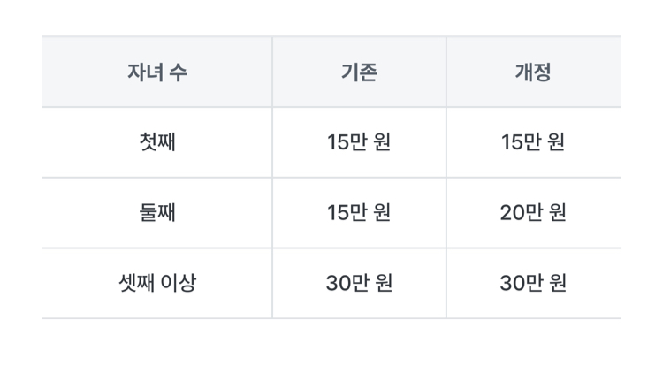 둘째 자녀는 기존 15만 원에서 20만 원으로 상향됩니다.