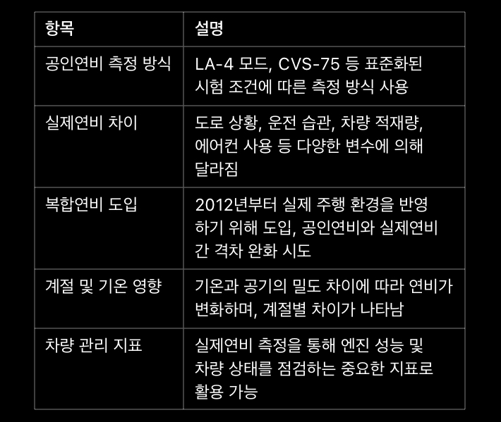 A: 실제연비는 운전 습관, 도로 상황, 차량 적재량, 에어컨 사용 등 다양한 실제 조건에 의해 영향을 받아 공인연비와 차이가 발생합니다.