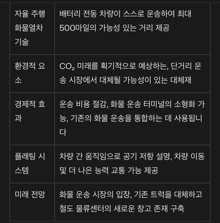 아래 표는 자율주행 배터리 전동 화물열차의 주요 정보와 장점을 요약한 내용입니다.