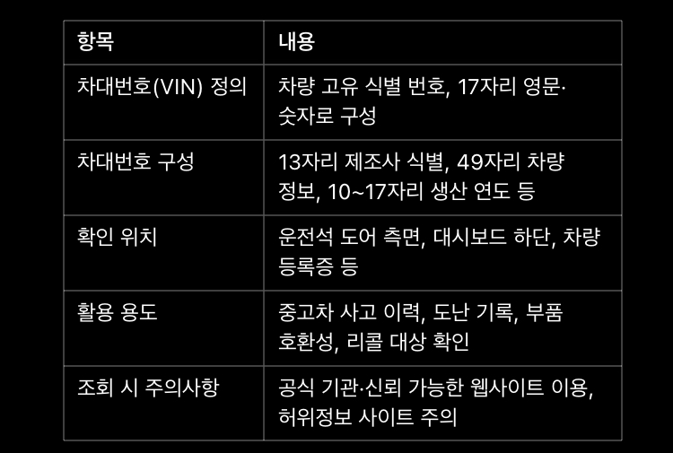 차대번호(VIN)는 차량의 과거와 현재, 그리고 잠재적인 미래 상태까지 짐작하게 해주는 ‘자동차의 DNA’입니다. 중고차 거래부터 사고 이력 확인, 부품 수급까지, 차대번호 하나로 해결할 수 있는 일이 많습니다. 무엇보다 중요한 것은 신뢰할 만한 채널을 통해 조회하고, 올바른 정보를 습득하는 것입니다. 이를 통해 우리는 보다 안전하고 현명한 자동차 생활을 누릴 수 있을 것입니다.