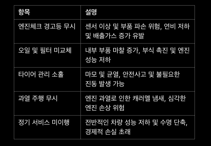 A: 정기 서비스 미이행은 차량의 전반적인 성능 저하와 수명 단축, 그리고 예기치 않은 고장으로 인한 경제적 손실을 초래할 수 있습니다.