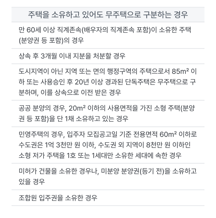 무주택자는 집이나 분양권 등의 소유가 없는 사람을 말해요. 하지만 조건에 따라 일부 주택 소유자도 무주택자로 인정될 수 있답니다. 예를 들어, 상속 받은 주택을 3개월 내에 처분한 경우도 무주택자로 간주돼요. 또한, 사용 면적이 20㎡ 이하인 소형 공공주택을 단 1채만 소유한 경우도 예외로 인정됩니다. 이처럼 무주택자 인정 기준은 다양하니 꼼꼼히 알아두세요!