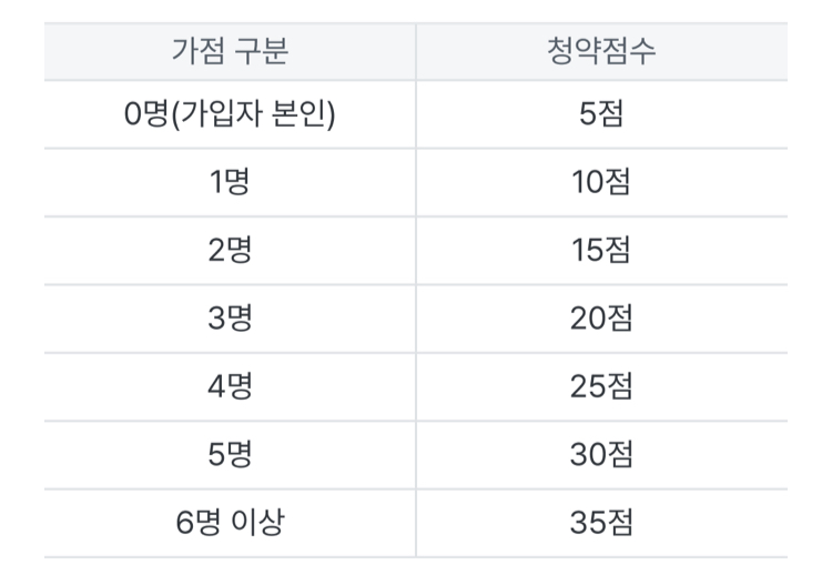 청약 가점에서 부양가족 수는 35점 만점으로 중요한 항목 중 하나입니다. 부양가족은 청약자의 생계를 책임지고 있는 가족으로, 배우자, 미혼 자녀 등이 포함돼요. 부양가족 수가 많을수록 가점이 높아지며, 최대 6명 이상일 때 35점을 받습니다.