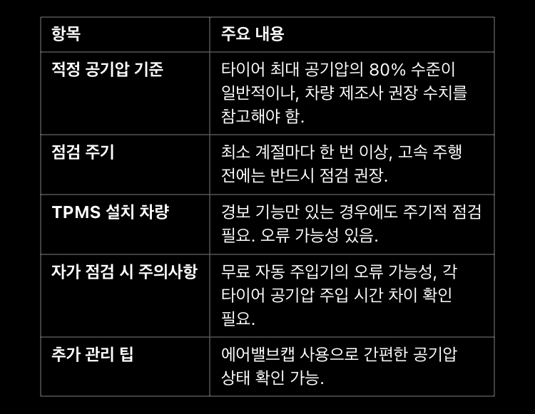 이처럼 타이어 공기압 점검은 안전 운전과 차량 성능을 지키는 필수 요소임을 잊지 말고, 주기적으로 확인해보세요!