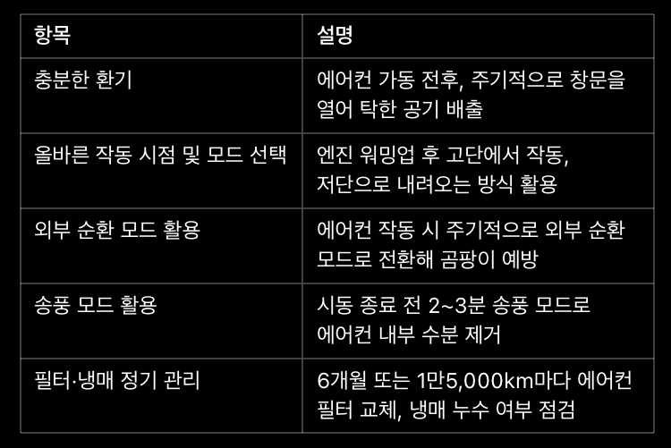 A: 시동 종료 전 2~3분간 송풍 모드로 작동시켜 에어컨 배관과 증발기에 남은 습기를 제거하는 것이 좋습니다.