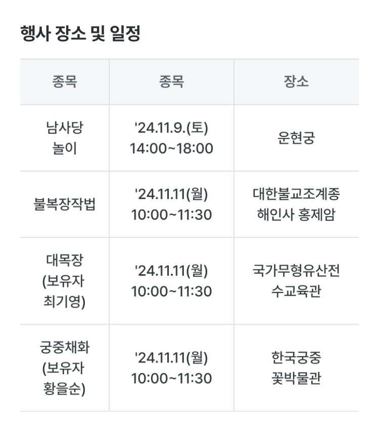 11월에 진행되는 국가무형유산 주요 행사 일정