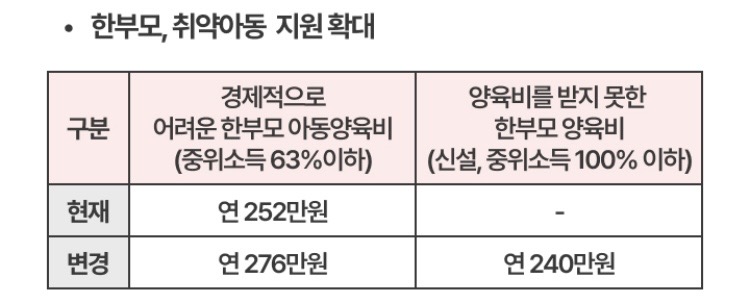 또한, 양육비를 받지 못한 한부모를 위한 신규 지원도 연 240만 원으로 신설됩니다.