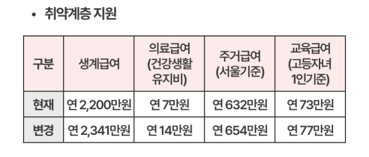 2025년에는 생계급여가 연 2,341만 원으로 늘어나고, 의료급여는 연 14만 원으로 두 배 증가합니다.