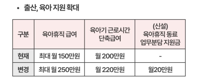 또한, 신설된 ‘육아휴직 종료 업무분담 지원금’은 월 20만 원을 추가로 제공해 육아 가정을 응원합니다.
