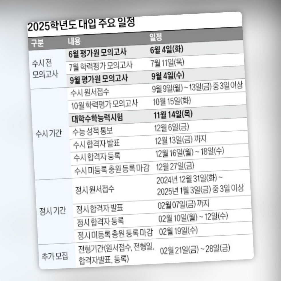 2025학년도 수능은 2024년 11월 14일에 시행됩니다. 이는 2026학년도 대학 입시를 준비하는 학생들에게 중요한 시험이 될 것입니다. 학생들은 남은 기간 동안 자신의 약점을 보완하고 강점을 강화하는 전략을 세워야 합니다. 특히, 국어와 수학의 선택과목은 자신의 진로와 관련된 과목을 선택하는 것이 유리합니다.
