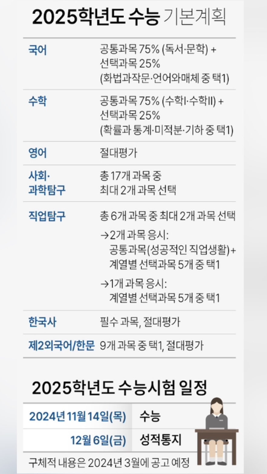 2025학년도 수능은 2015 개정 교육과정에 맞춰 출제됩니다. 모든 과목은 공교육 범위 내에서 출제되며, 학생들이 학교에서 배운 내용을 바탕으로 충분히 대비할 수 있도록 구성됩니다. 특히, 국어와 수학 영역에서는 공통과목과 선택과목 구조가 유지되며, 이는 학생들이 자신의 학습 스타일과 진로에 맞는 선택을 할 수 있도록 돕습니다.