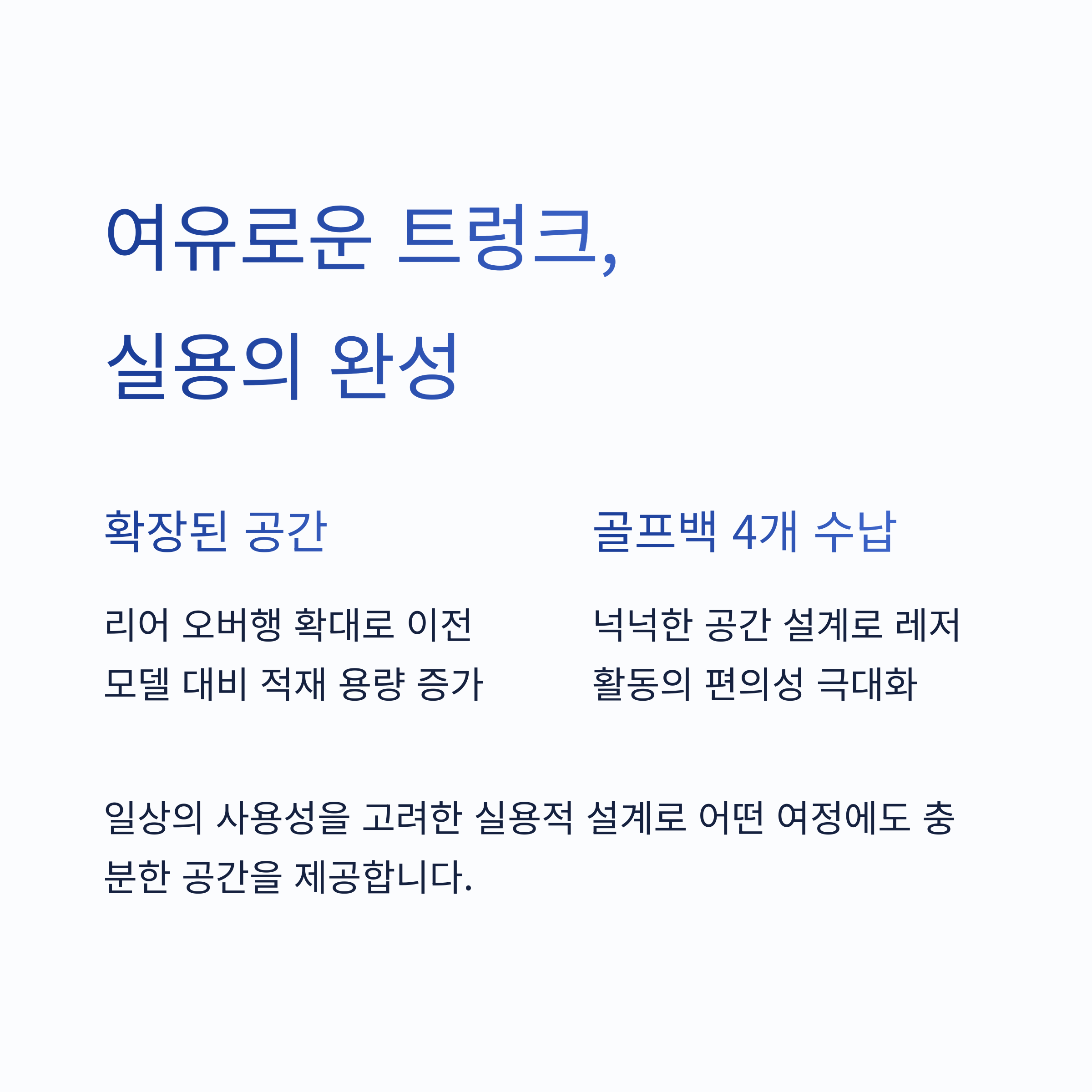 2025 넥쏘는 실용성에서도 눈에 띄는 발전을 이뤘습니다. 리어 오버행을 무려 80mm 확장하여 골프백 4개를 수납할 수 있을 만큼 넓은 적재공간을 제공합니다. 이는 패밀리카나 캠핑용 차량으로도 손색없는 활용성을 뜻하며, 실제로 레저·여가용 수소차로 각광받고 있습니다.