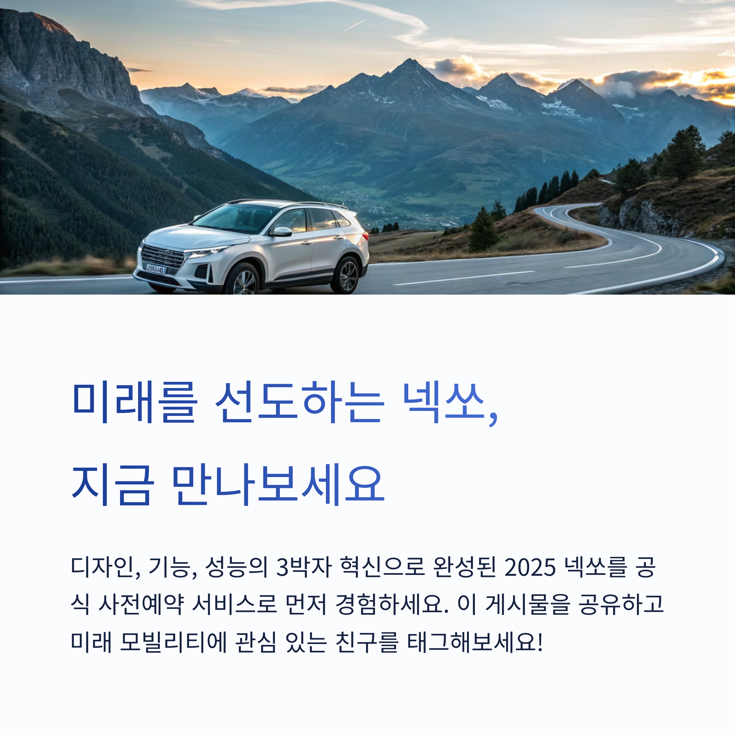 이처럼 넥쏘는 미래 모빌리티의 방향성을 제시하는 동시에, 오늘날의 소비자 니즈까지 반영한 균형 잡힌 진화를 보여줍니다. 앞으로 다가올 수소 시대에 가장 먼저 다가갈 차량이 어떤 모습일지 궁금하시다면, 2025 넥쏘를 주목해 보시길 바랍니다. 스마트한 기술과 지속 가능성을 동시에 담은 이 차는, 분명 여러분의 새로운 라이프스타일을 이끌어줄 파트너가 될 것입니다.