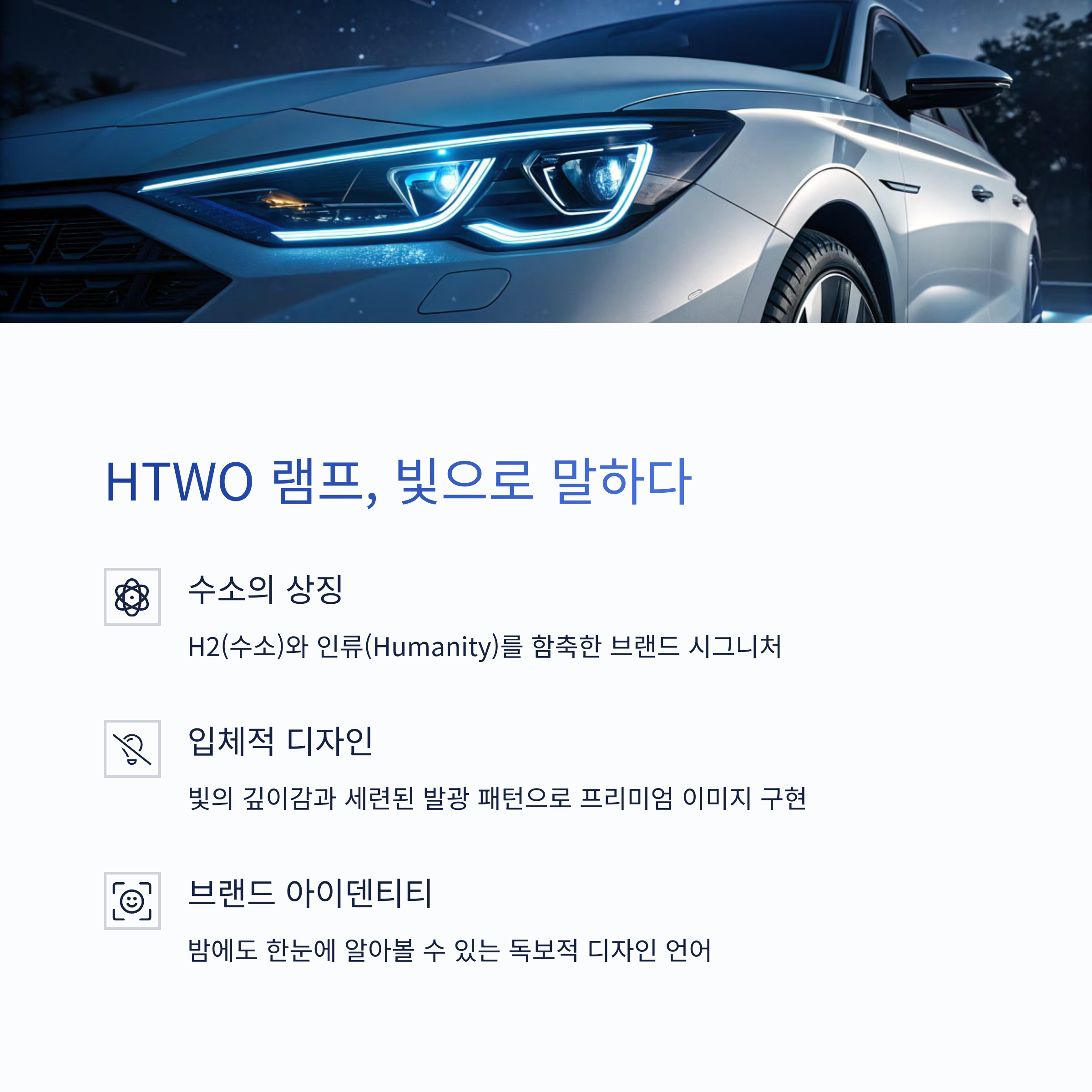 2025 넥쏘의 가장 큰 변화는 외관 디자인에서 시작됩니다. 현대자동차의 새로운 디자인 철학인 ‘아트 오브 스틸(Art of Steel)’이 적용되어, 금속의 물성과 기하학적인 구조미가 강하게 부각됩니다. 전면부에는 현대차그룹의 수소 브랜드인 HTWO 로고가 적용된 조명 시스템이 탑재되어, 주행 시 미래지향적 분위기를 자아냅니다.