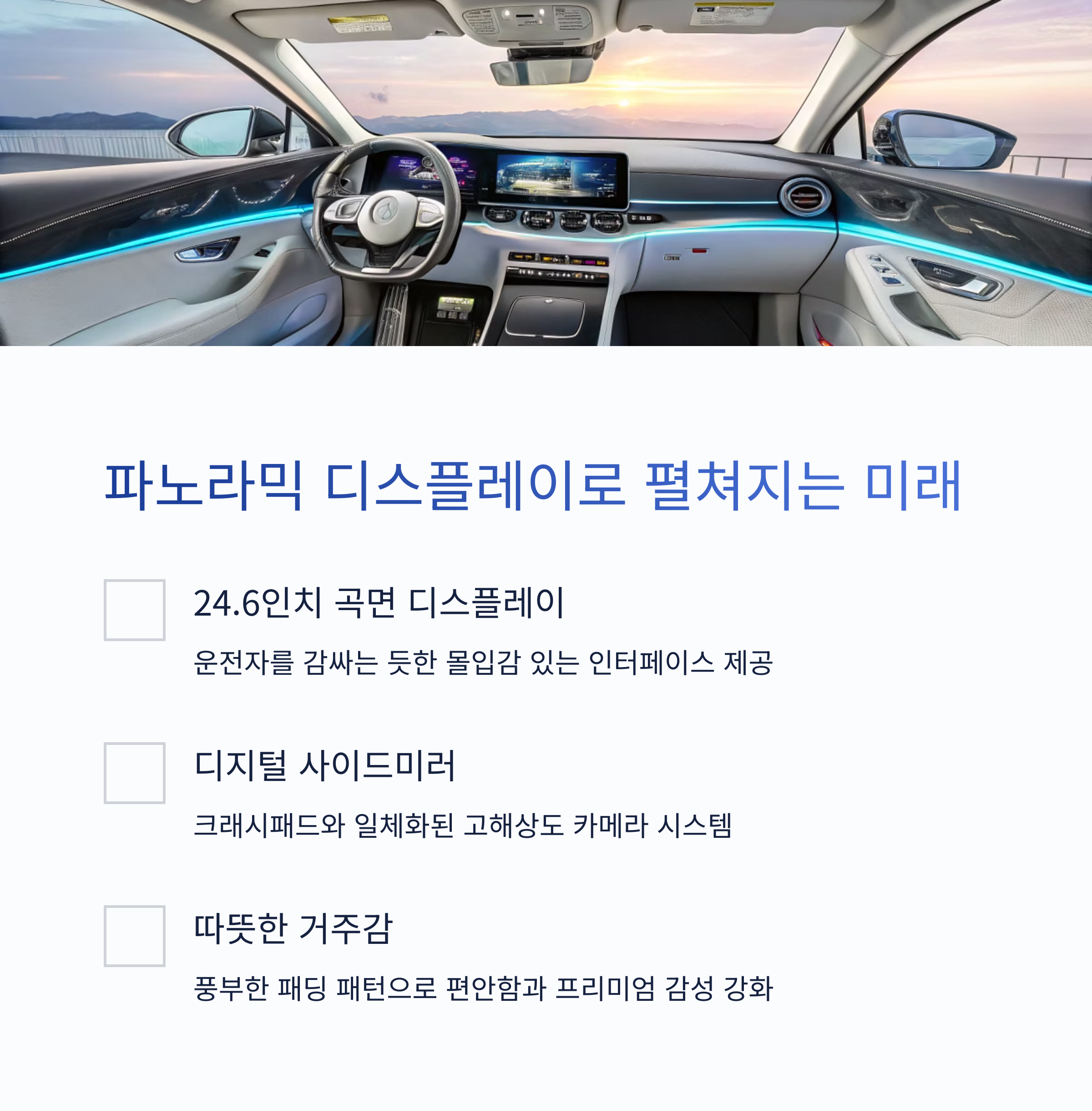 2025 넥쏘의 인테리어는 전작과 비교해 훨씬 더 디지털화되고 고급스럽게 진화했습니다. 가장 눈에 띄는 점은 파노라믹 커브드 디스플레이로, 계기판과 중앙 디스플레이가 유기적으로 연결되어 시인성과 몰입감을 동시에 제공합니다. 또한, 디지털 사이드 미러가 대시보드와 일체형으로 설계되어 하이테크한 분위기를 극대화합니다.