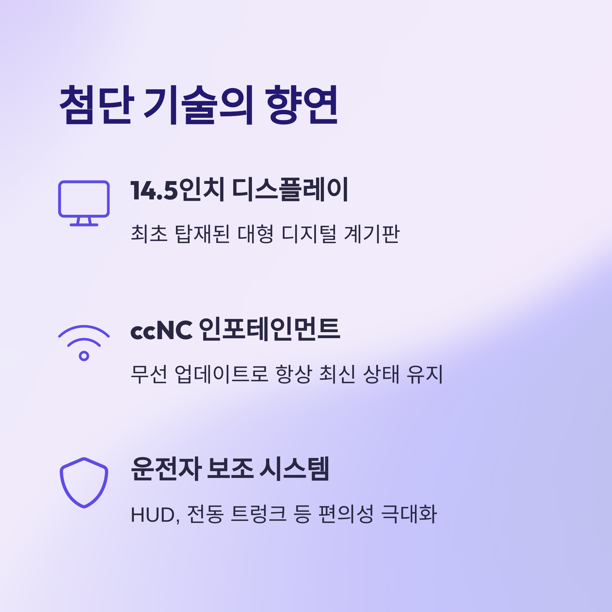 | 🧠 첨단 기술 | 14.5인치 디스플레이 + HUD + 스마트센스 |